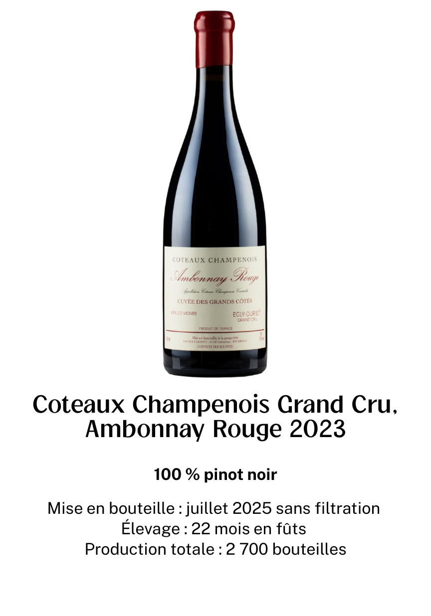 Naast de iconische champagnes produceert Egly-Ouriet ook een aantal zeldzame wijnen. Coteaux Champenois Rode wijnen gemaakt van Pinot Noir. Deze stille wijnen worden in zeer kleine hoeveelheden geproduceerd en behoren tot de meest gewilde wijnen in de appellatie. Ze worden bewonderd om hun Bourgondische karakter en opmerkelijke diepte.